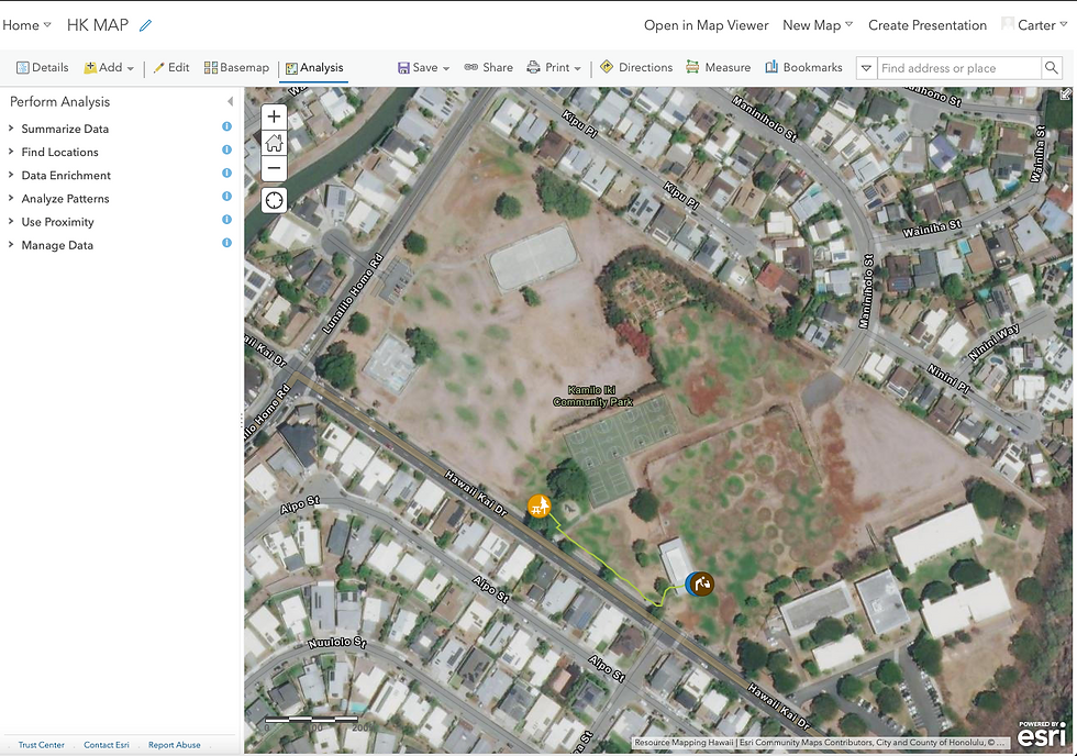 I choose to make a map of Kamilo Iki Community Park which is located about 5 minutes from my home. I used the sidewalk and paved paths to go from the picnic table to the bathroom and water fountain. Link to the map: https://arcg.is/18Pfai - Images for the picnic table, bathroom, and water fountain are included in the map.